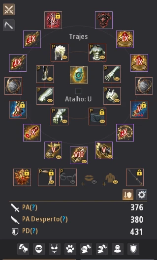 Muitos conjuntos Pedras da Luz, tanto PVP, PVE e Life Skill. Tem Kabua de ‘Danos nas Costas’ e Kabua de ‘Dano contra Humanóides’.