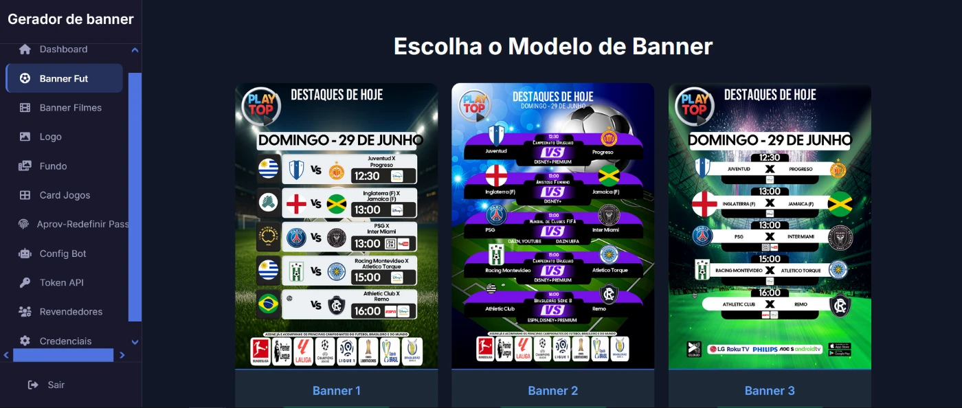 Transforme sua página esportiva com banners prontos, modernos e personalizados! Com o FutBanner, você gera artes de jogos automaticamente e ainda pode revender o sistema, criando uma nova fonte de renda online.