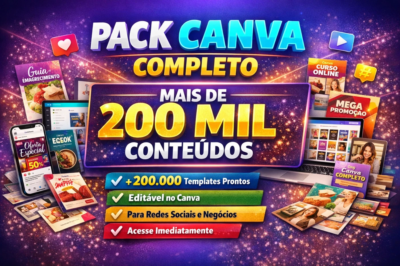 Com o Pack C4nv@ Completo – Mais de 200 Mil Conteúdos, você terá acesso imediato a um acervo gigantesco de materiais prontos para usar, editar e vender, mesmo que você seja iniciante.