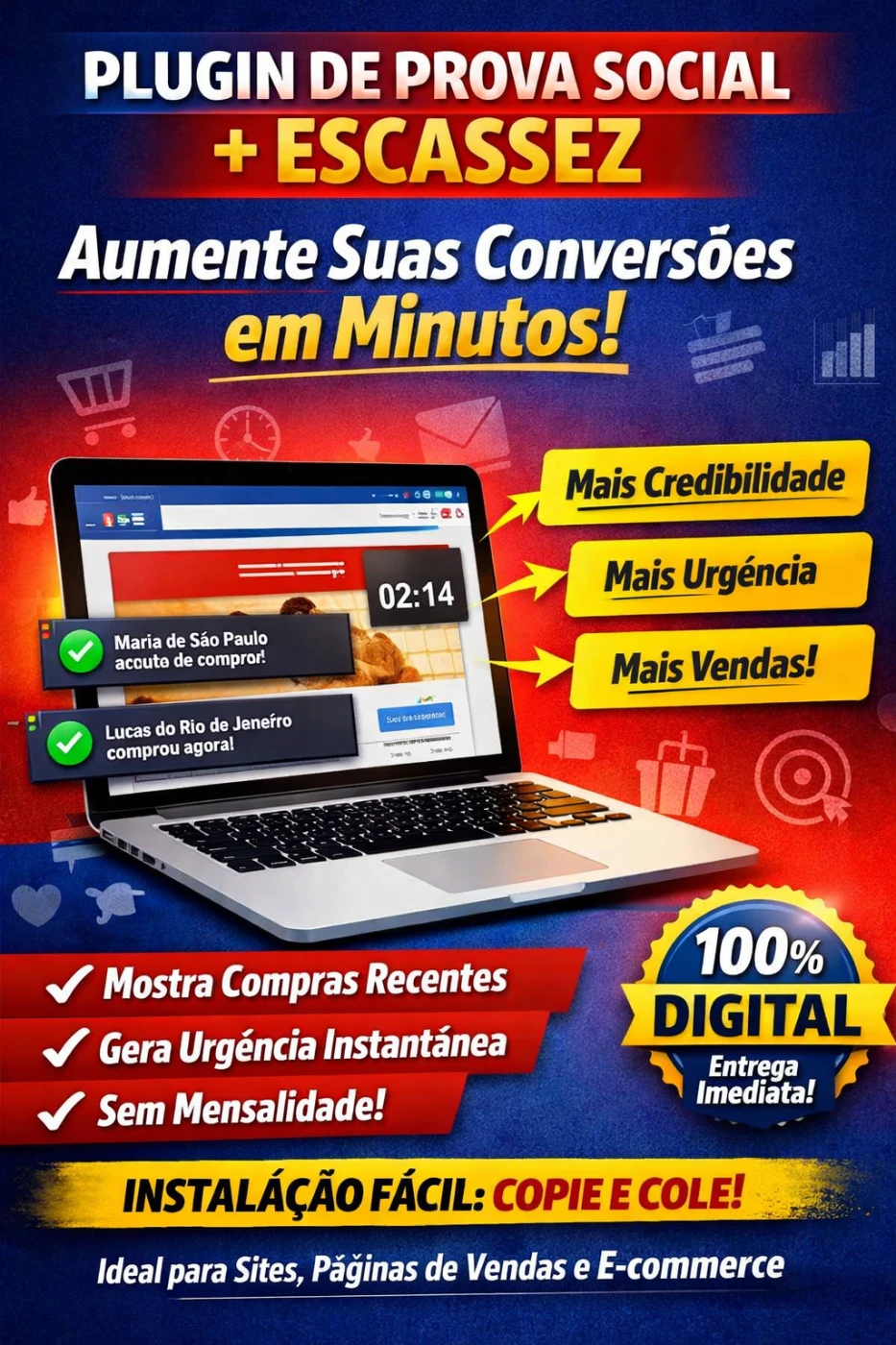Transforme visitantes indecisos em compradores com este plugin de prova social e escassez visual, ideal para sites, páginas de vendas e landing pages.