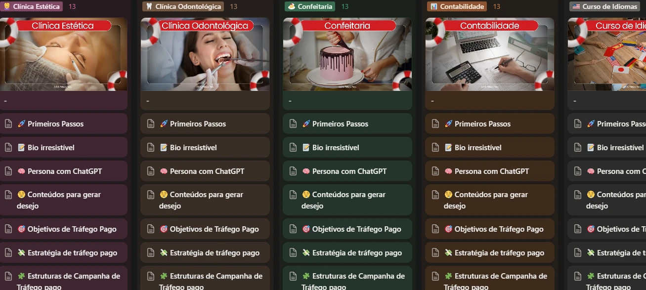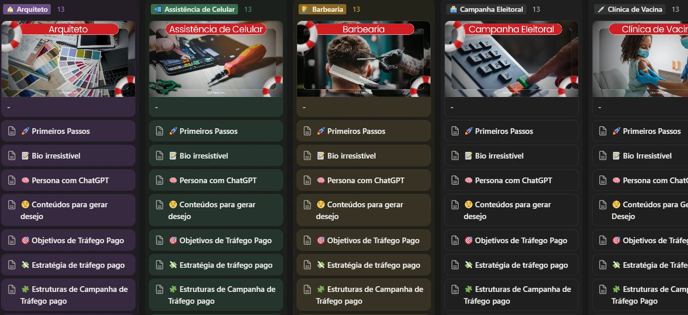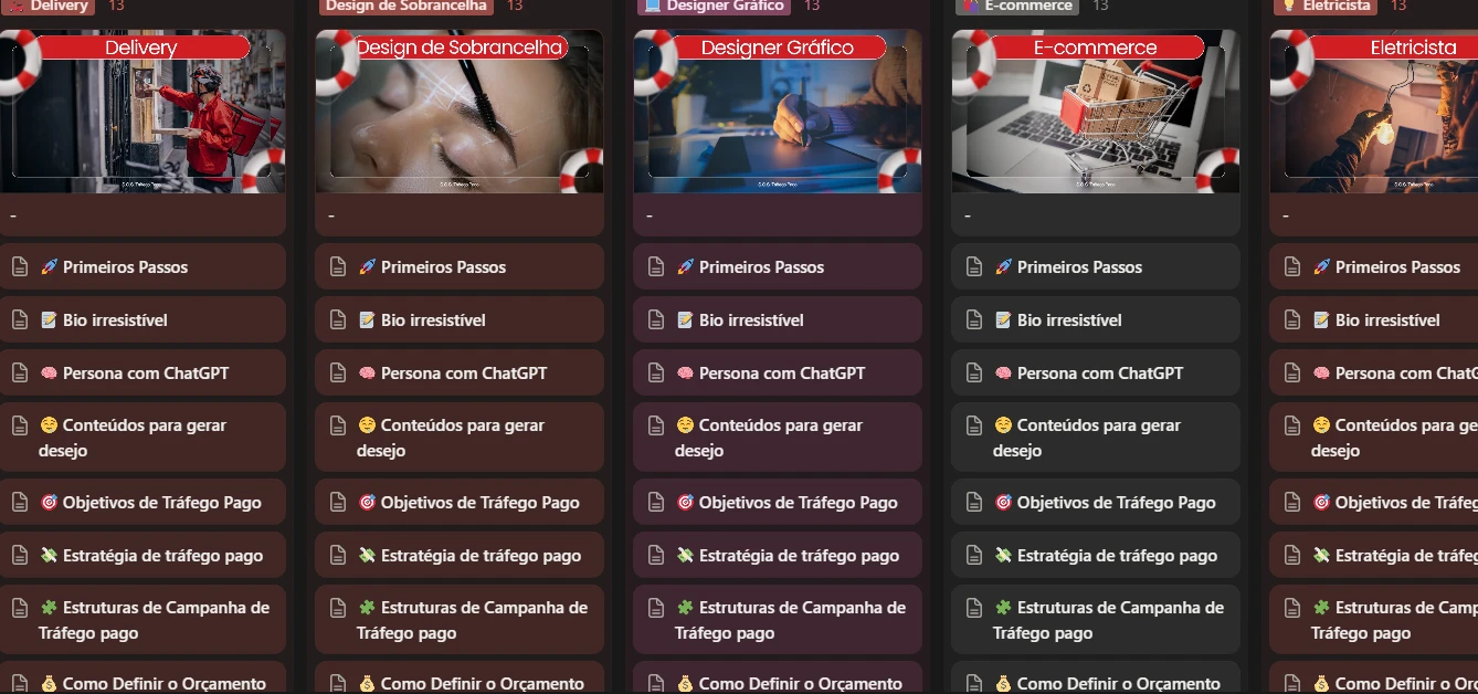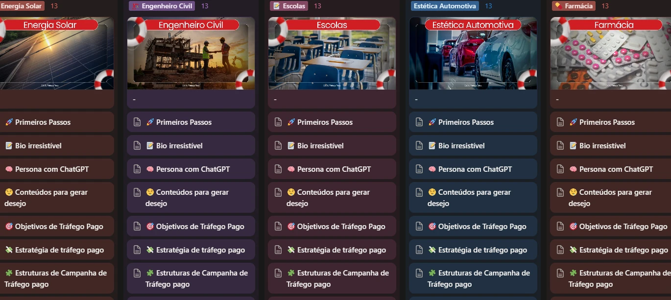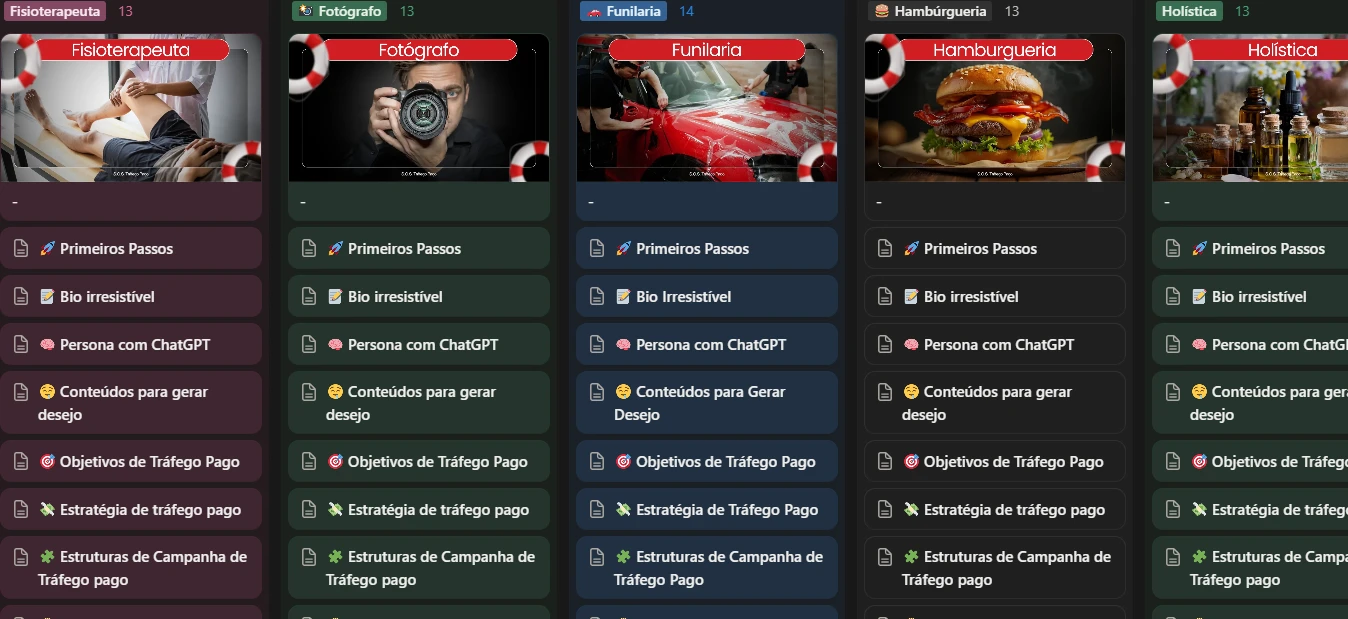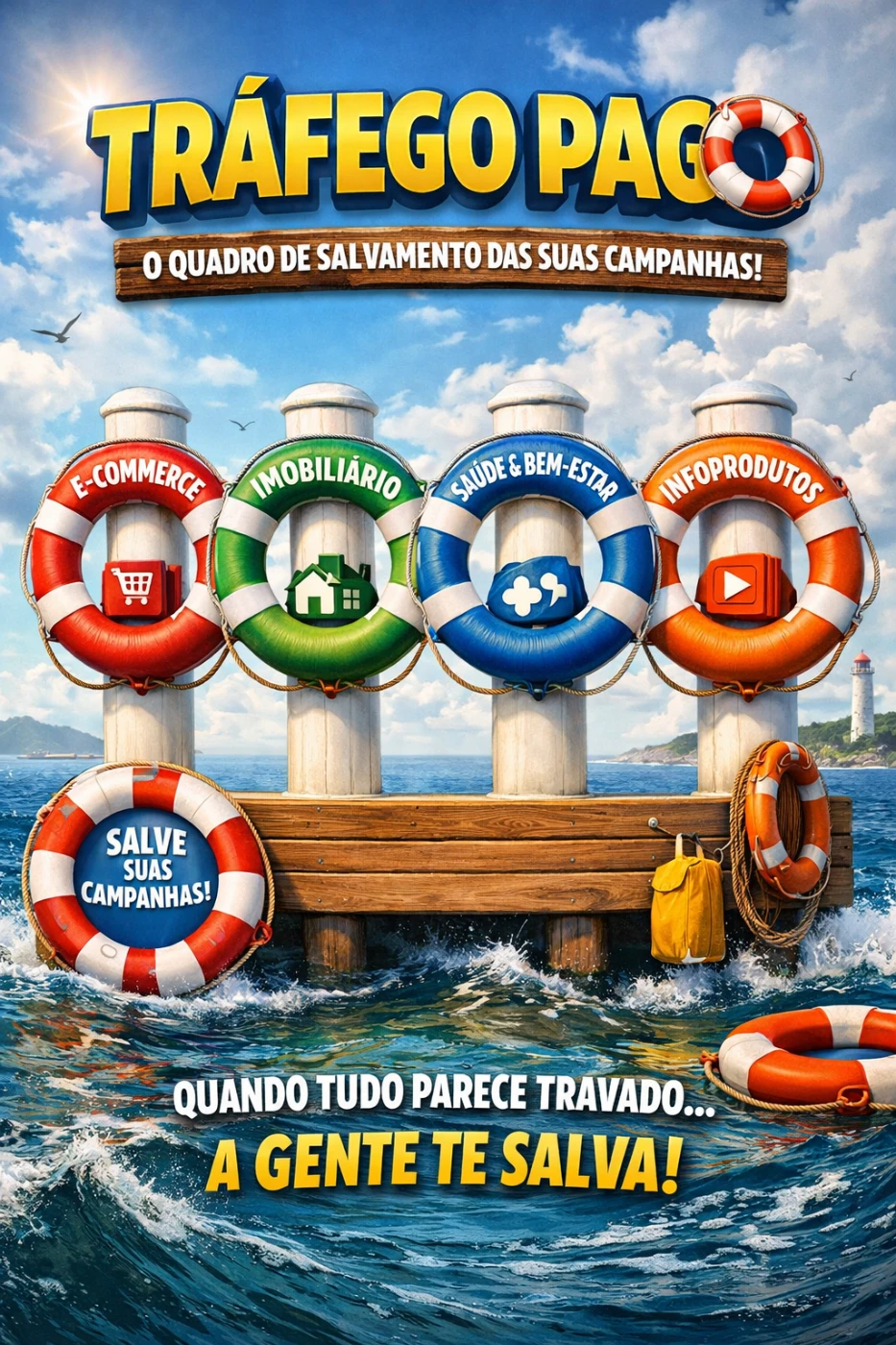 O Tráfego Pago é o quadro de salvamento das suas campanhas. Cada coluna representa uma boia salva-vidas pensada para um nicho específico.