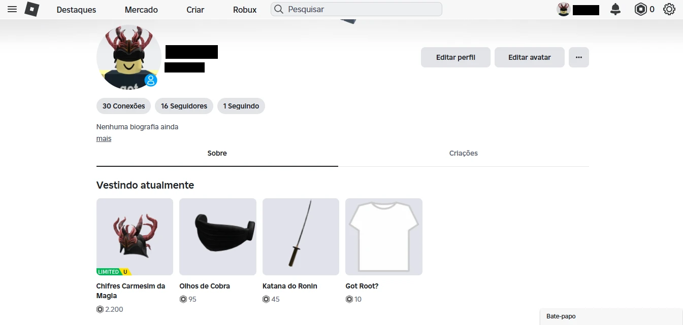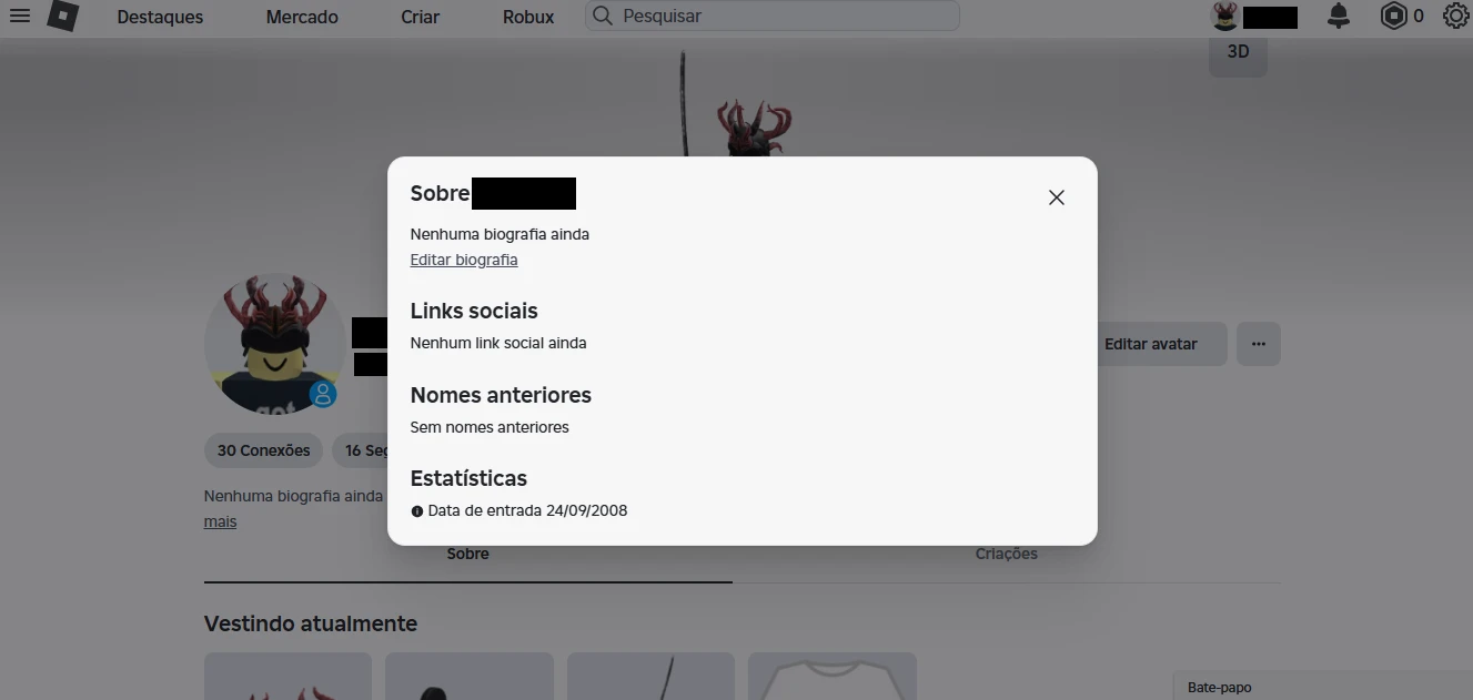 Conta do Roblox criada em 2008 contendo um item limitado único (Limited U)